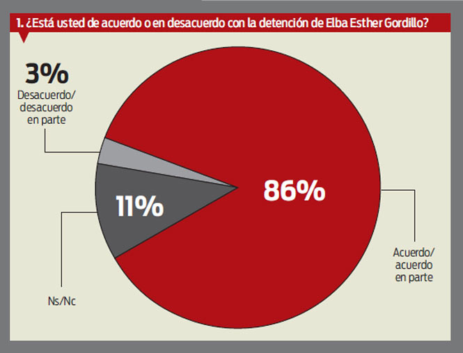 La aprehensión de Gordillo fue ampliamente conocida, 91% de la población con teléfono en su vivienda supo de la detención. De los enterados, 86% se dijo de acuerdo o en parte (gráfico 1).